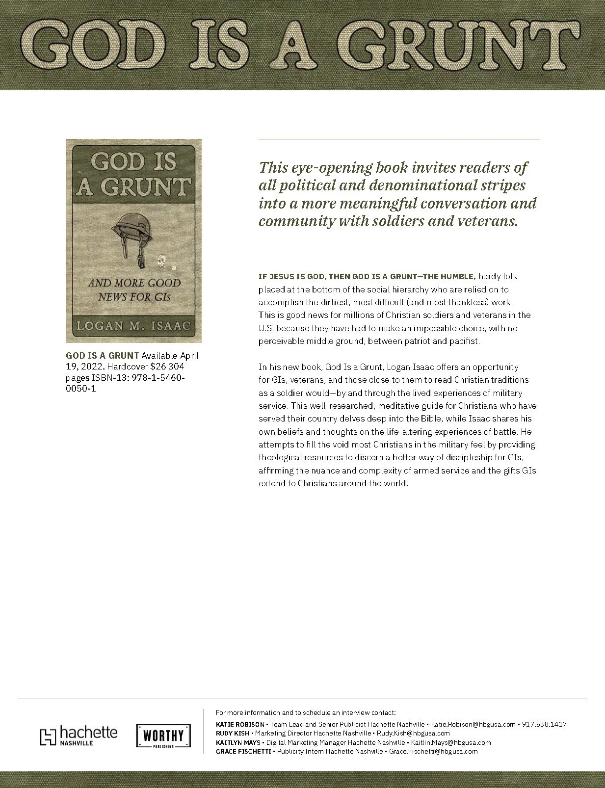“When one soldier and 17 veterans take their lives everyday in so-called 'God-blessed America,' it's time to have a serious conversation about the Christian faith and military service. God is a Grunt forces readers to wrestle with brave moral questions about war-waging and peacemaking, mental health and neighbor-love. With a mix of righteous anger and theological imagination, Logan M. Isaacchallenges popular misconceptions that will disturb the easy confidence of partisan readers on both sides of the aisle. This book isn't safe, but it is good.”