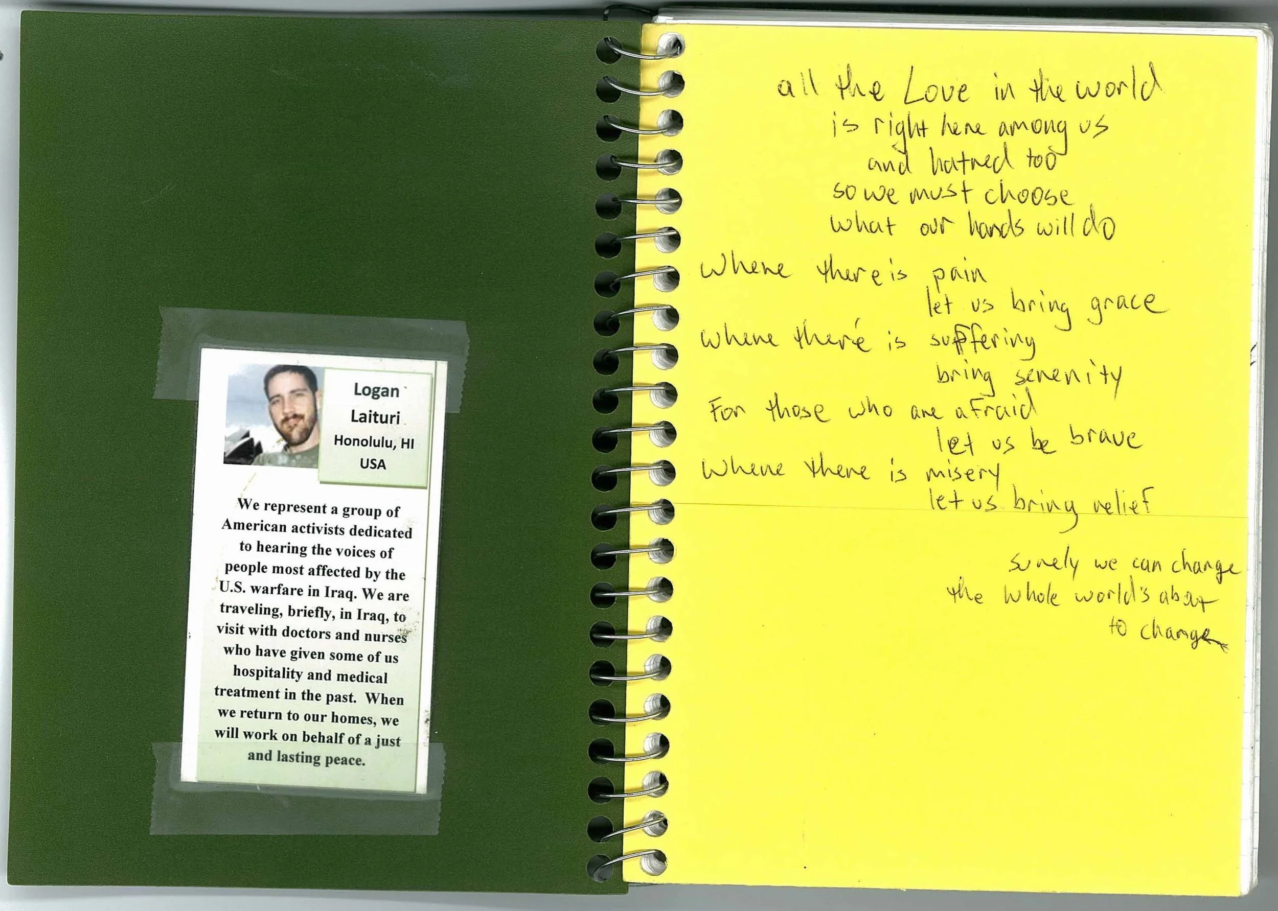 On the inside left cover of my Rutba journal is a ‘panic card’ with information on why we were there. The reverse sides were in Arabic so we could show them to local Iraqis and explain what we were doing there: