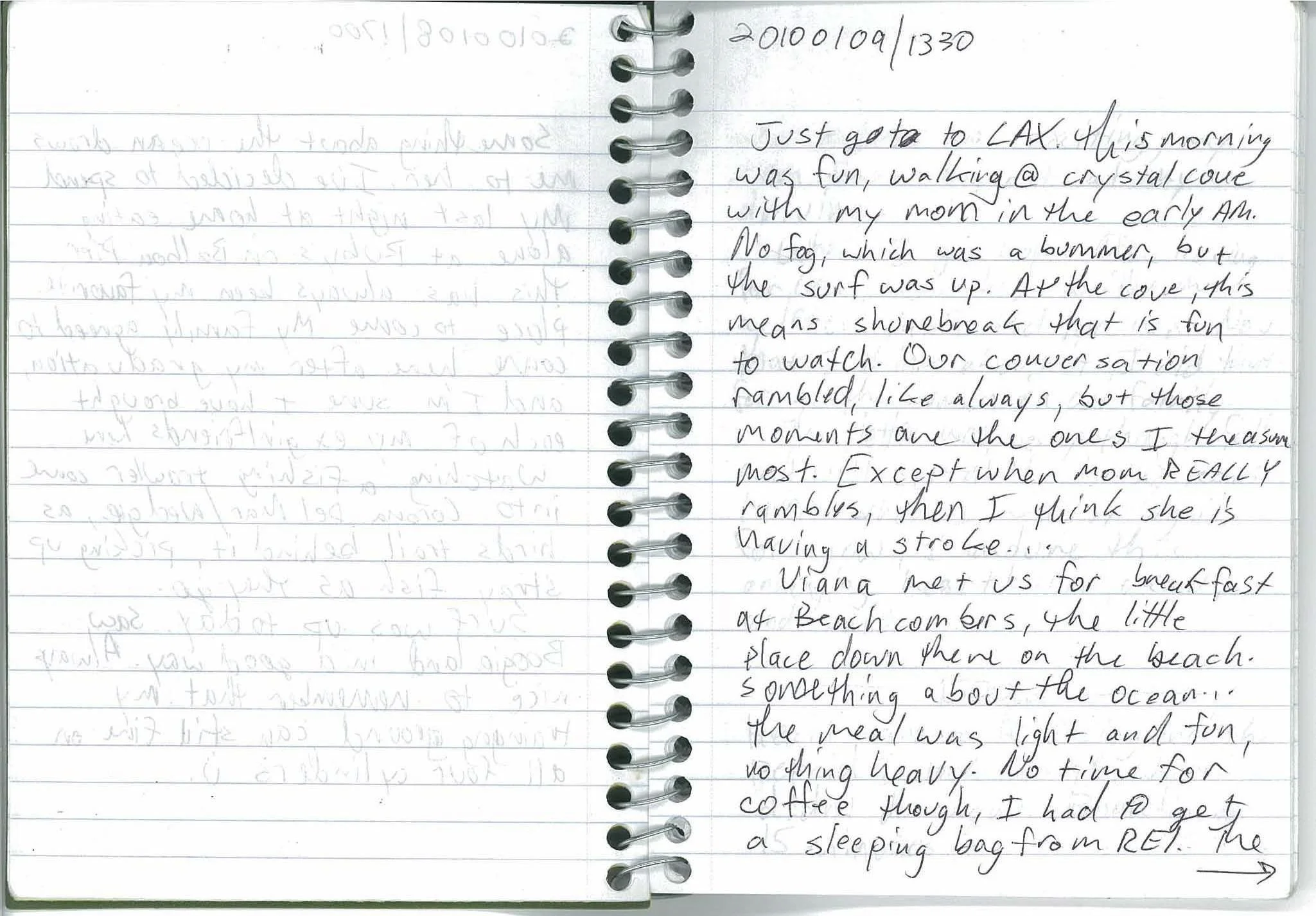 Viana met us for breakfast at Beachcombers, the little place down there on the beach. Something about the ocean… The meal was light and fun, nothing heavy. No time for coffee, though, I had to get a sleeping bag from REI. The...