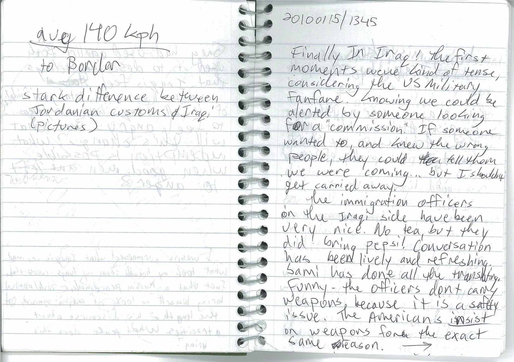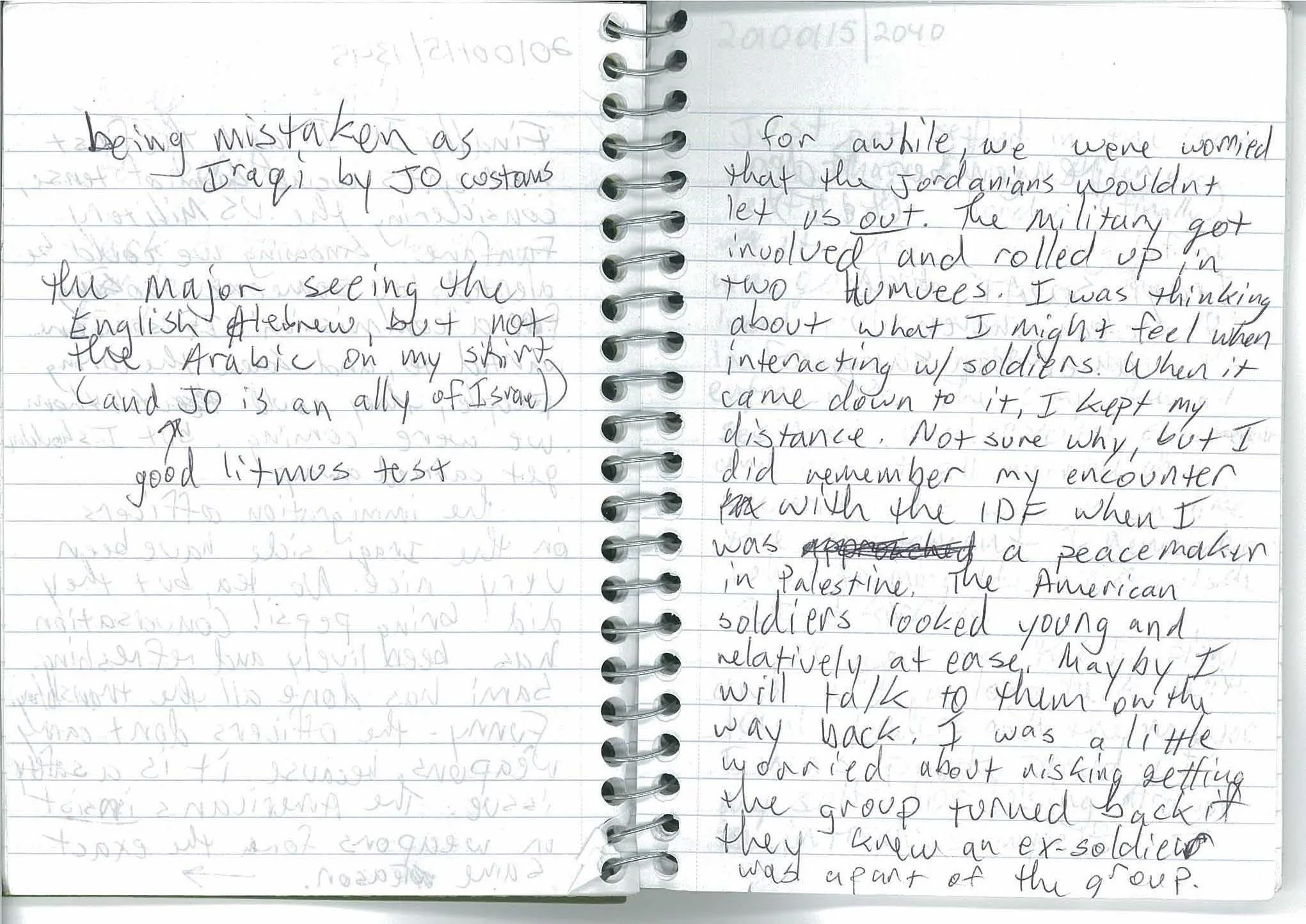 For awhile, we were worried that the Jordanians wouldn’t let us out. The military got involved and rolled up in two Humvees. I was thinking about what I might feel when interacting with soldiers. When it came down to it, I kept my distance. Not sure why, but I did remember my encounter with the [Israeli Defense Forces] when I was a peacemaker in Palestine. The American soldiers looked young and relatively at ease. Maybe I will talk to them on the way back. I was a little worried about risking getting the group turned back if they knew an ex-soldier was a part of the group.