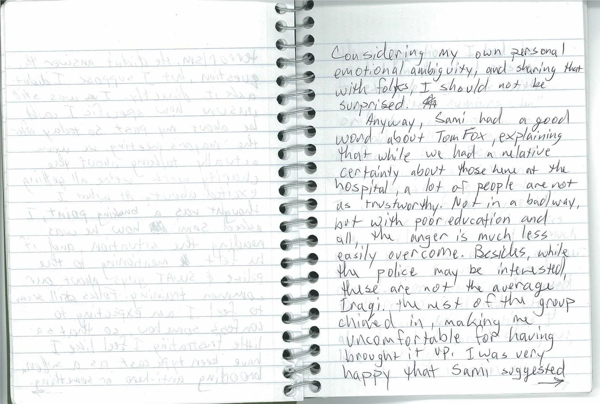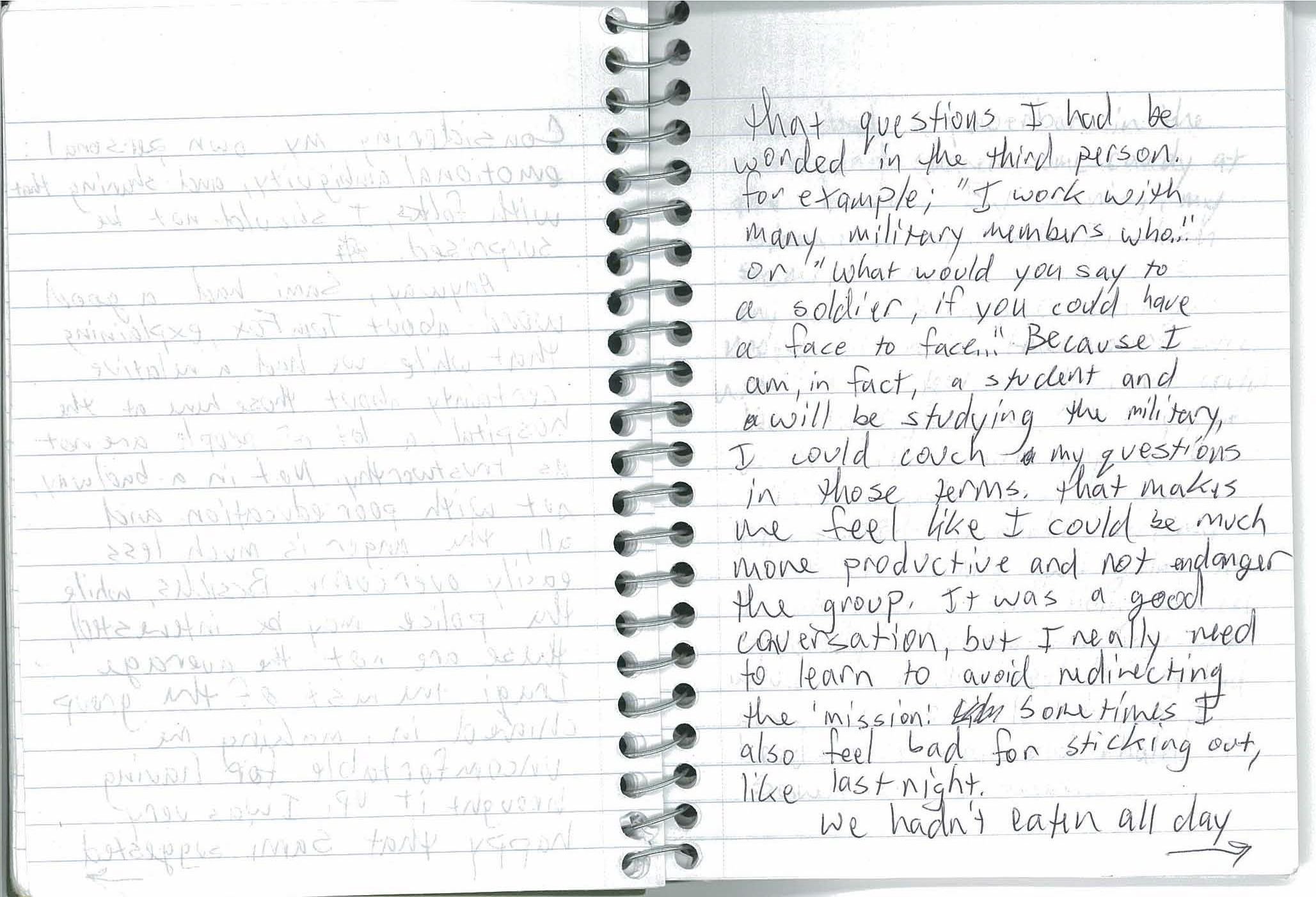...that questions I had be worded in the third person. For example; “I work with many military members who...” or “what would you say to a soldier, if you could have a face to face?” Because I am, in fact, a student and will be studying the military, I could couch my questions in those terms. That makes me feel like I could be much more productive and not endanger the group. It was a good conversation, but I really need to learn to avoid redirecting the ‘mission.’ Sometimes I also feel bad for sticking out, like last night.