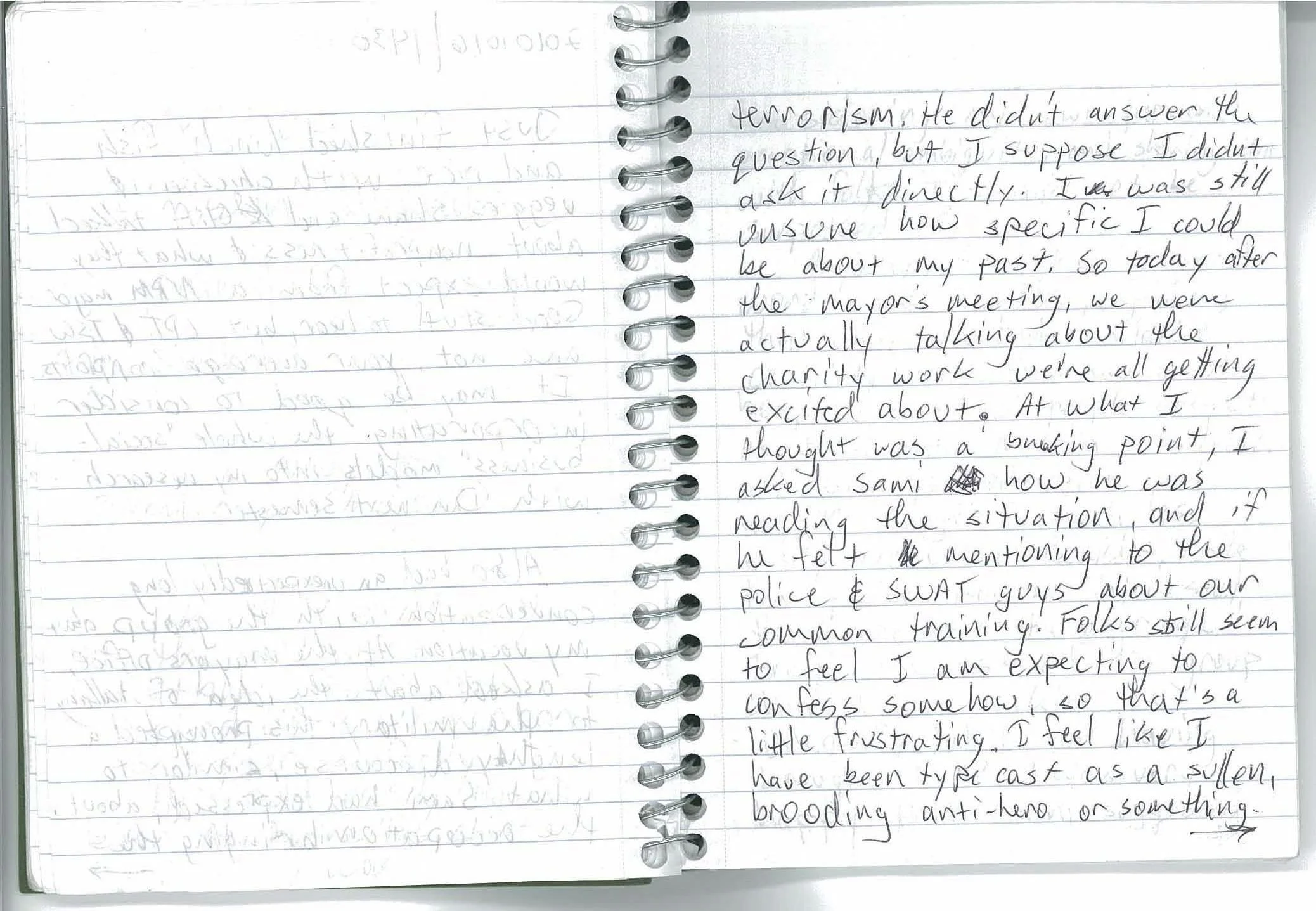 ...terrorism. He didn’t answer the question, but I supposed I didn’t ask it directly. I was still unsure how specific I could be about my past. So today after the mayor’s meeting, we were actually talking about the charity work we’re all getting excited about. At what I thought was a breaking point, I asked Sami how he was reading the situation, and if he felt mentioning to the police and SWAT guys about our common training. Folks still seem to feel I am expecting to confess somehow, so that’s a little frustrating. I feel like I have been typecast as a sullen, brooding anti-hero or something.