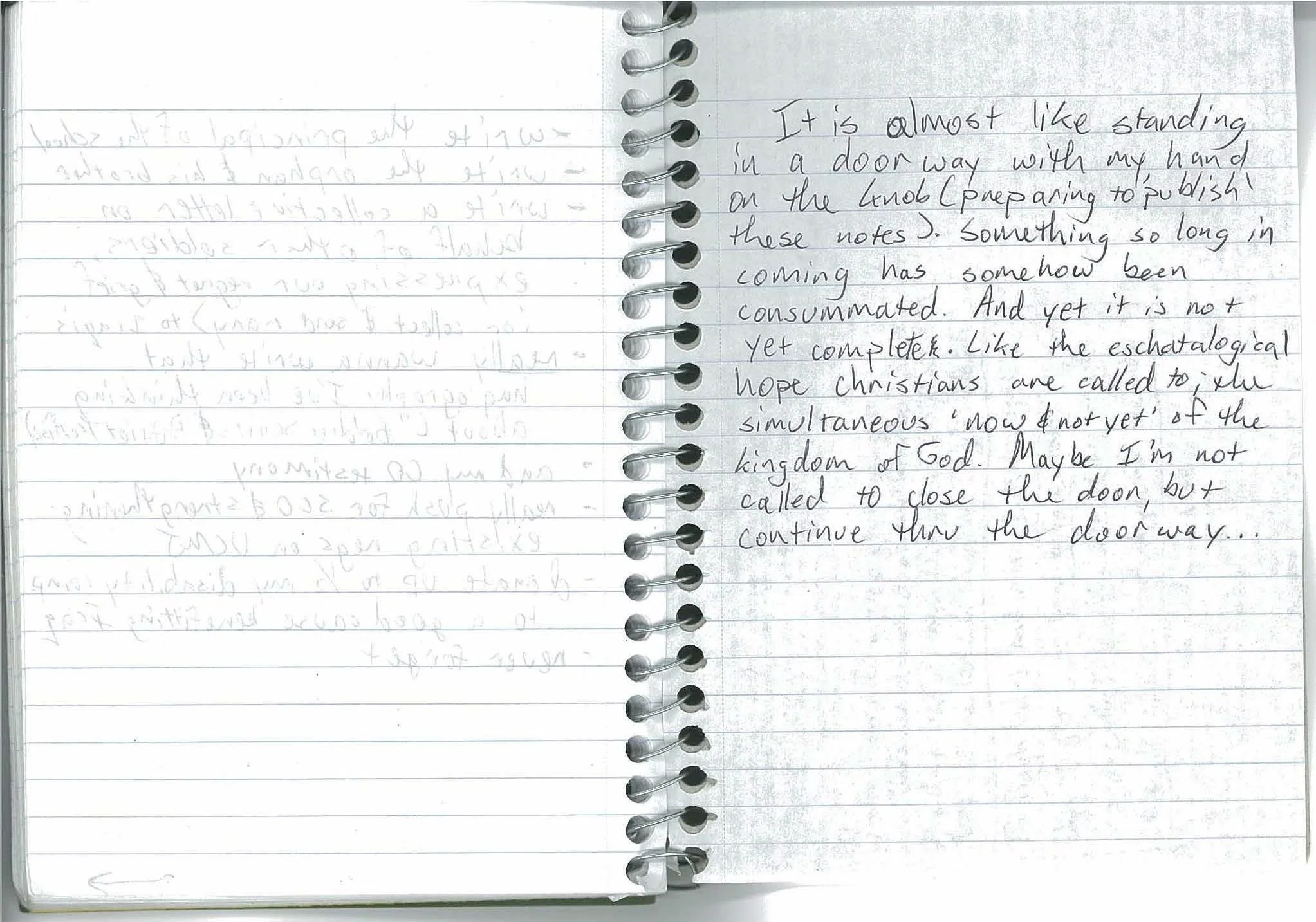 It is almost like standing in a doorway with my hand on the knob (preparing to ‘publish’ these notes). Something so long in coming has somehow been consummated. And yet it is not yet complete. Like the eschatological hope Christians are called to; the simultaneous ‘now and not yet’ of the kingdom of God. Maybe I’m not called to close the door, but continue through the doorway...