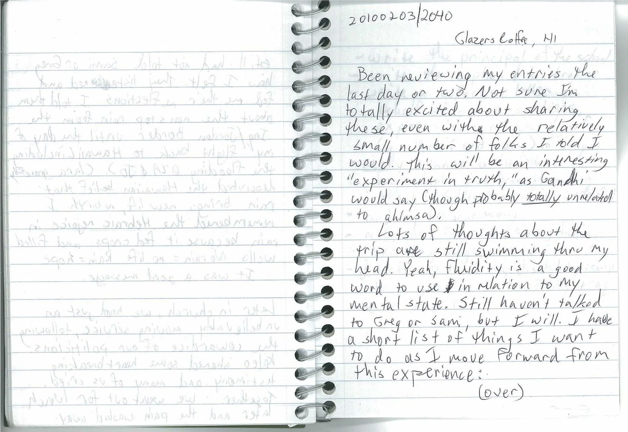 Been reviewing my entries the last day or two. Not sure I’m totally excited about sharing these, even with the relatively small number of folks I told I would. This will be an interesting “experiment in truth” as Gandhi would say (though probably totally unrelated to ahimsa).