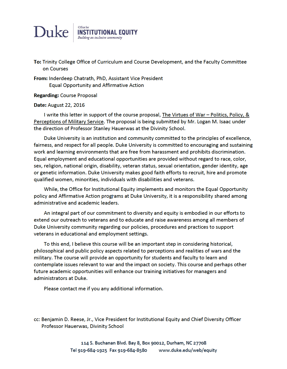I write this letter in support of the course proposal, The Virtues of War – Politics, Policy, & Perceptions of Military Service. The proposal is being submitted by Mr. Logan M. Isaac under the direction of Professor Stanley Hauerwas at the Divinity School.